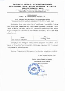 Kubu Raya – Proses Seleksi Calon Dewan Pengawas Perumda Air Minum Tirta Raya Kubu Raya telah memasuki babak akhir. Bupati Kubu Raya Sujiwo telah memilih satu Calon Dewan Pengawas Perumda Air Minum sebagaimna dalam lampiran pengumuman ini.
